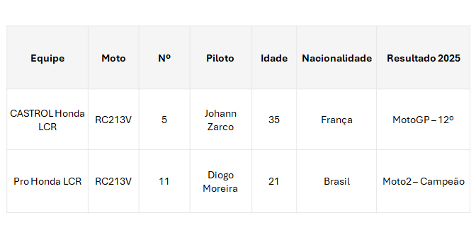 Para a temporada 2026, a Honda LCR terá uma formação com duas motos no MotoGP. Ao lado de Johann Zarco (França, 35 anos) na CASTROL Honda LCR, a equipe apresentará uma segunda entrada intitulada Pro Honda LCR, com a Pro Honda — marca genuína de óleos e fluidos da Honda — como patrocinadora principal.